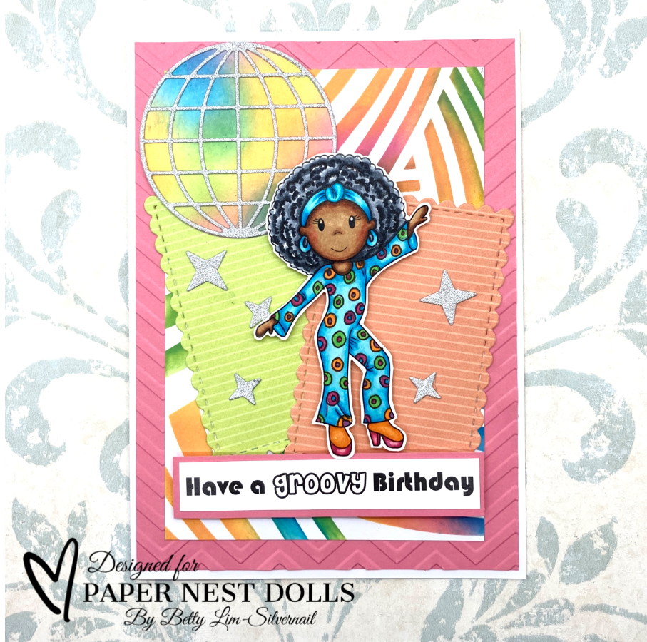 Hello PND Fans! Betty here today. What is your favorite decade? My favorite is the 70's, because I love the bright color fashions, the music, the disco! Paper Nest Dolls came out with new stamps called Decade Dolls and the first one I had to color is Disco Amara. Of course, I had to make a disco scene for Amara! There are 10 Decade Dolls that you can find on the Paper Nest Dolls digital store. They are available in red rubber stamps as well.