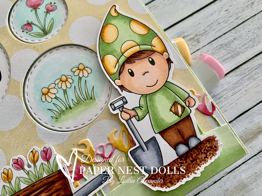 Laurie here! I am sharing my Blooming Wishes Birthday Card that was published in the March Issue (#242) of the Simply Cards and Papercraft Magazine. I was honoured when Christine Young, owner of Paper Nest Dolls, asked me to create a card to be published using Watering Can Gnome from the